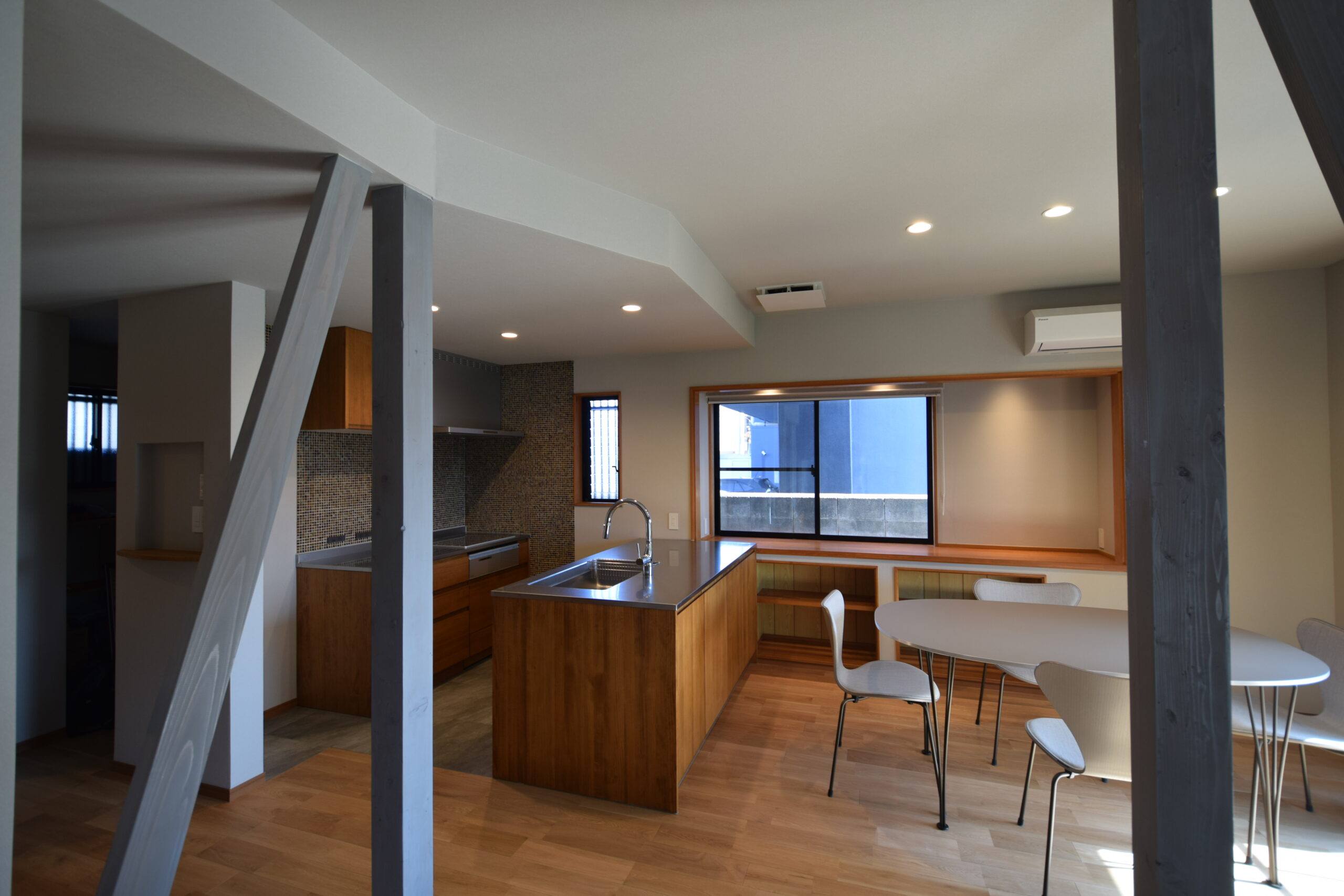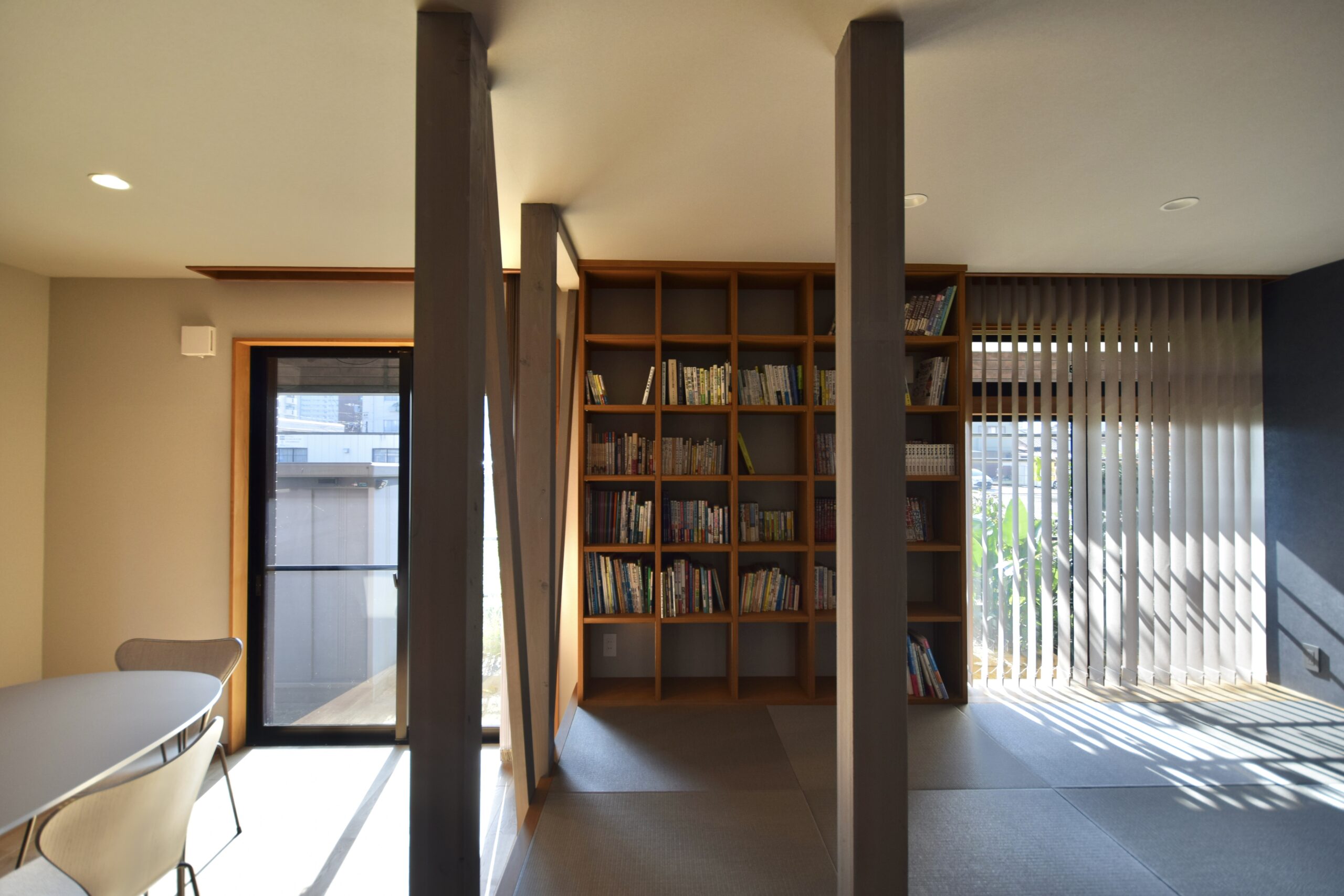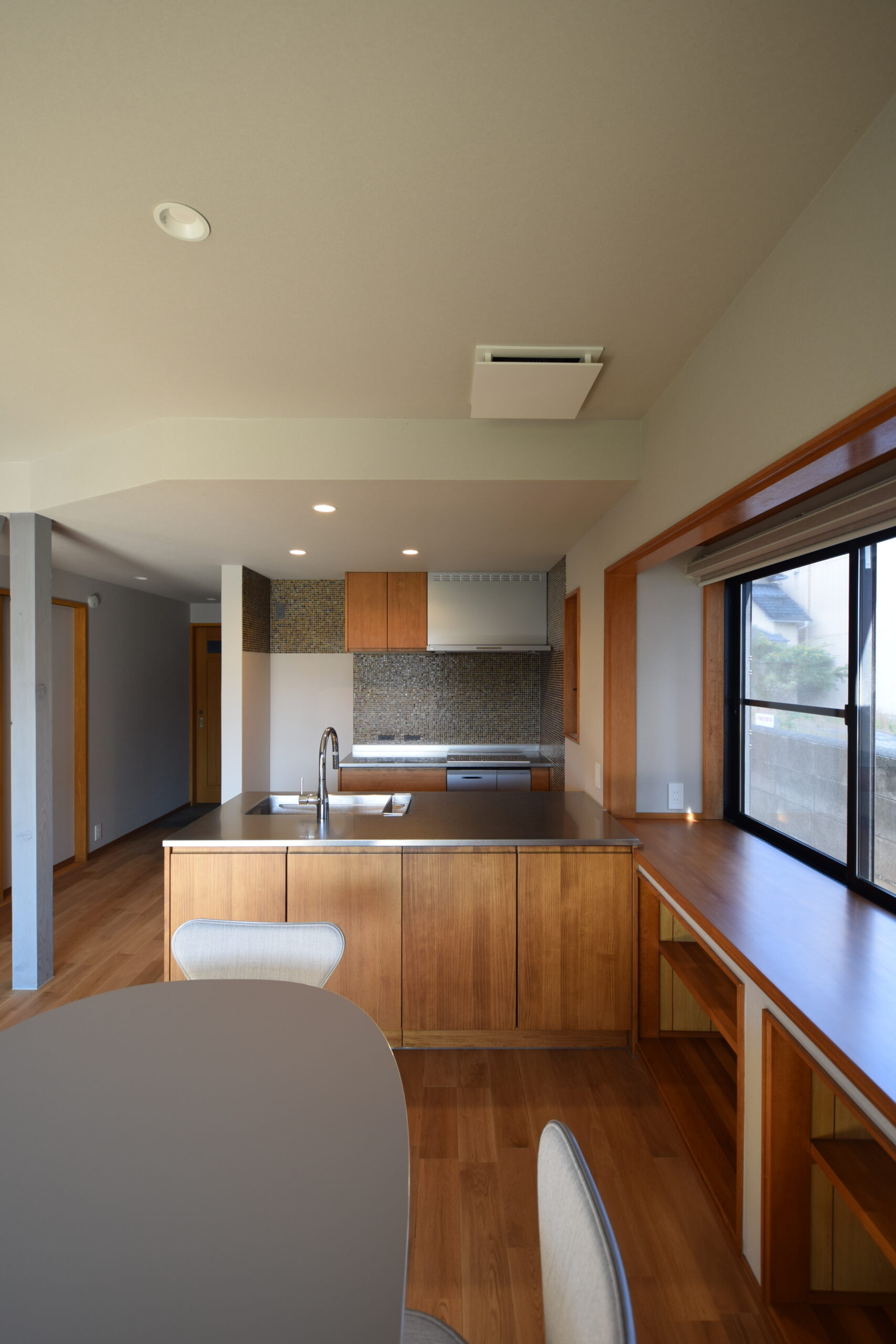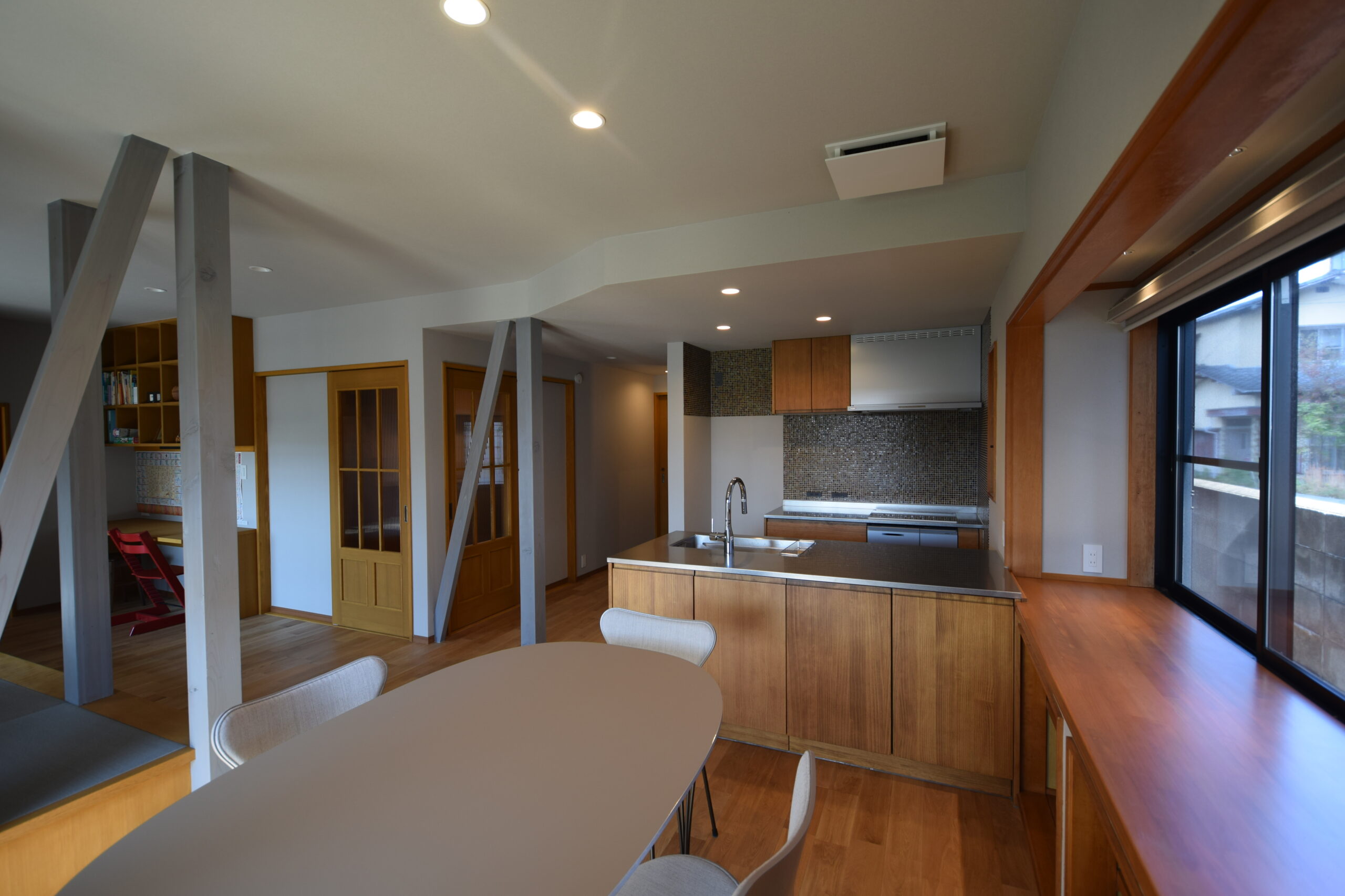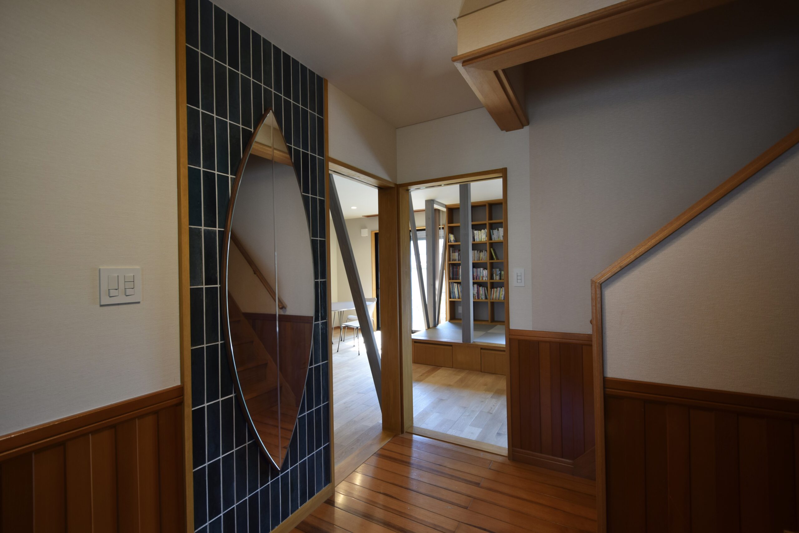 閑静な住宅街の奥にある「アトリエの家」。亡くなったお父さまが設計事務所をされていて我が家と同じく自宅兼アトリエのお住まい。お子さん世帯の同居にあたってのリノベーションです。私たちへのお声掛けがとても有難く、お父さまの設計やデザインを出来るだけ活かして次世代に引き継いで行くように計画を進めました。元々あった大きな吹き抜けのあるリビングが特徴でしたが、キッチンが閉鎖的で見通しが悪かったので、先ずはキッチンをオープンにして壁を取り、キッチンからのリビングへの視界を抜けるようにしました。そして、リビングには大きな本棚を設置してデザインと機能性を両立させました。随所にお父さまの痕跡を残しながら進める作業は、対話をしているような感覚でした。お母さまと娘さん夫婦がお父さまの建築に包まれているような感覚になればと想いを込めて、私たちなりに新しい家族の暮らしをイメージしながら一味加え、30年経ったお家に新しい命が吹き込まれ生き生きとした空間に生まれ変わりました。