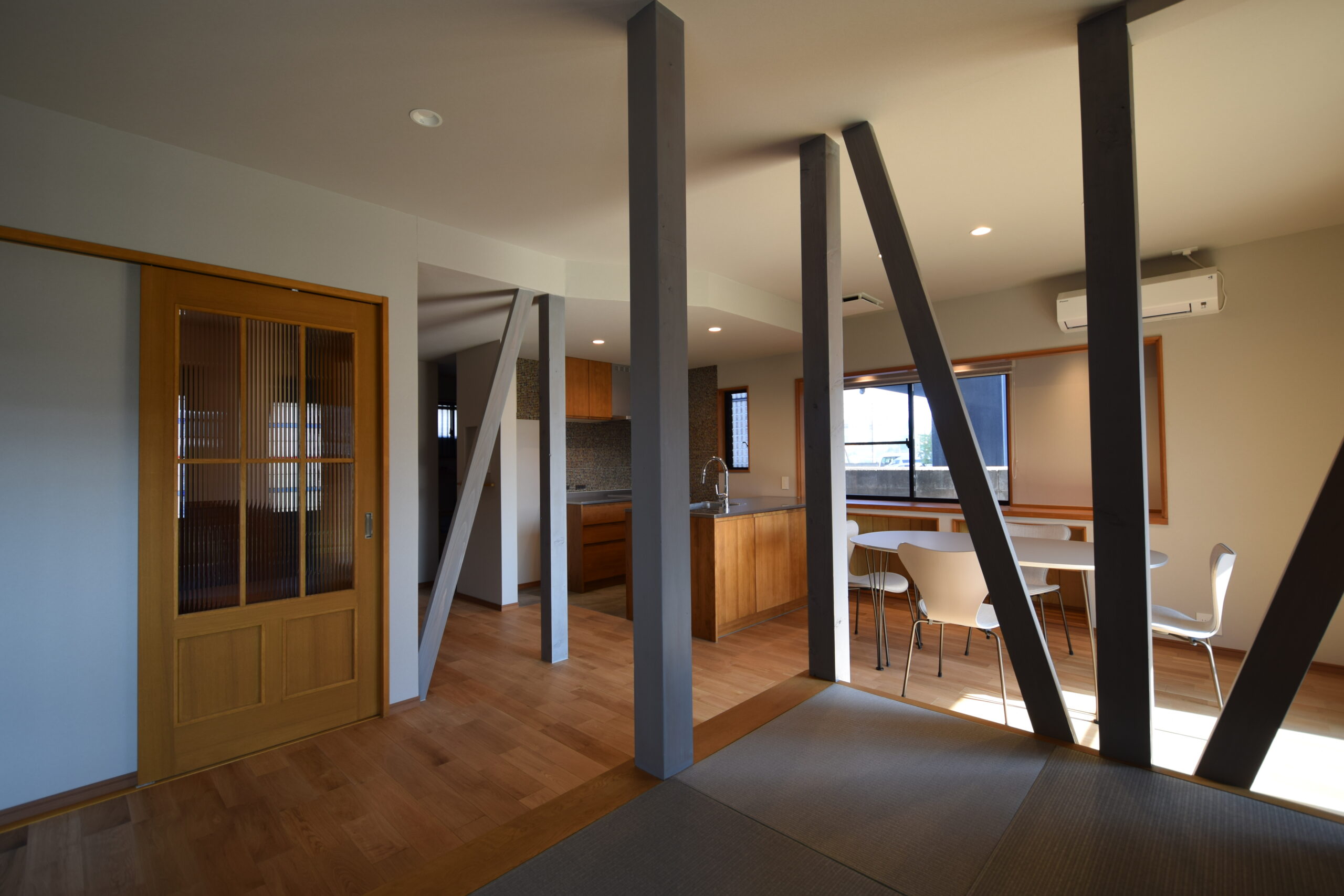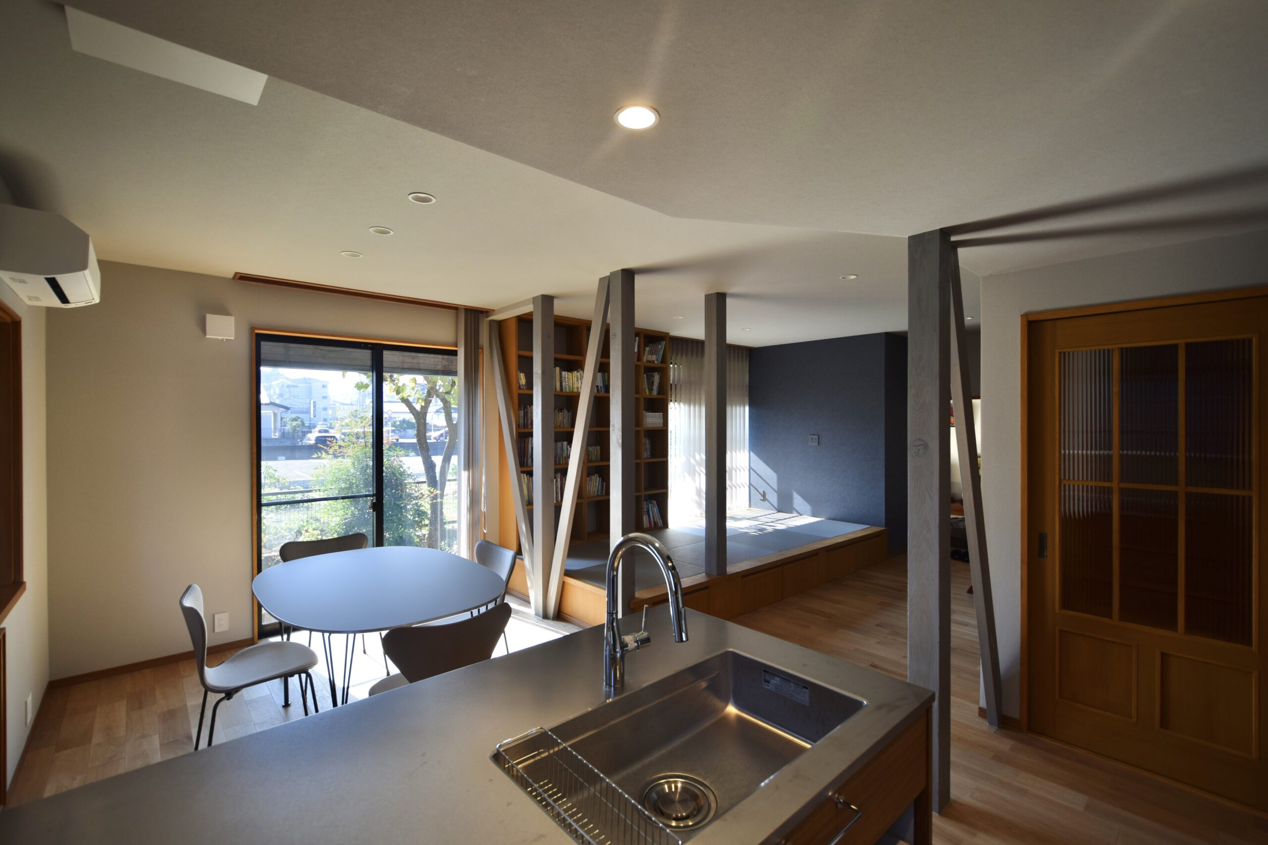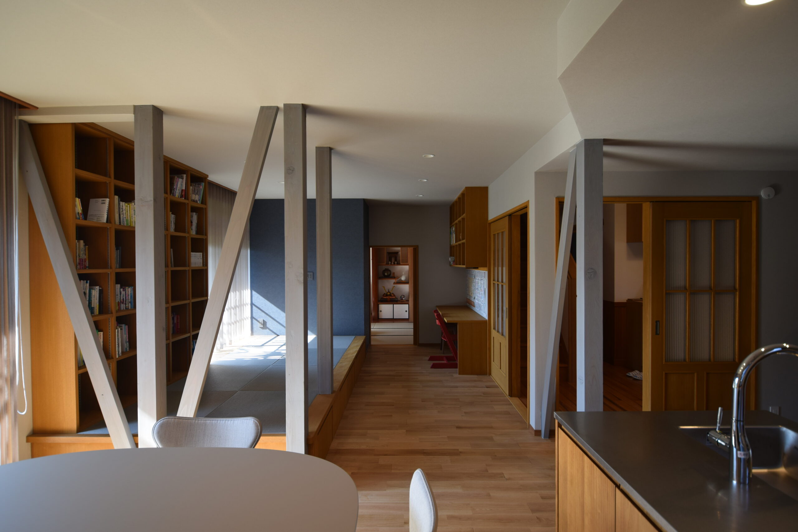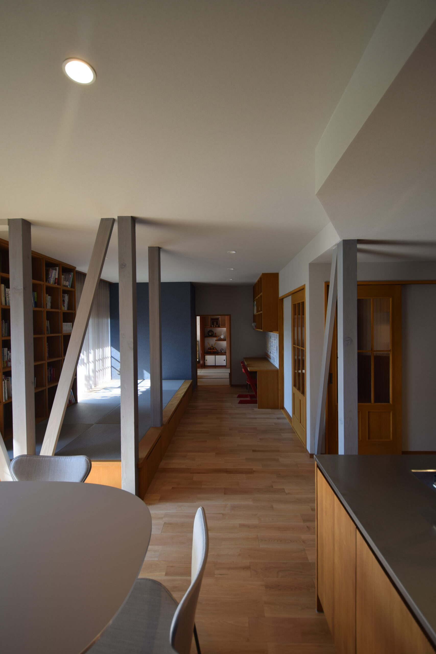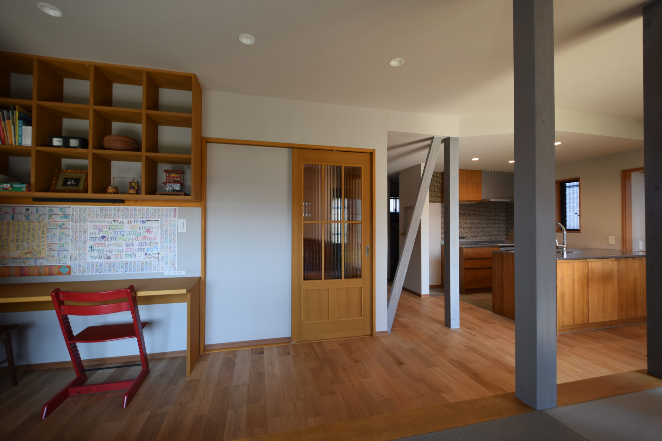 屋を繋げて開放的な空間にし、小上がりやデスクスペースなど家族の気配を感じながら過