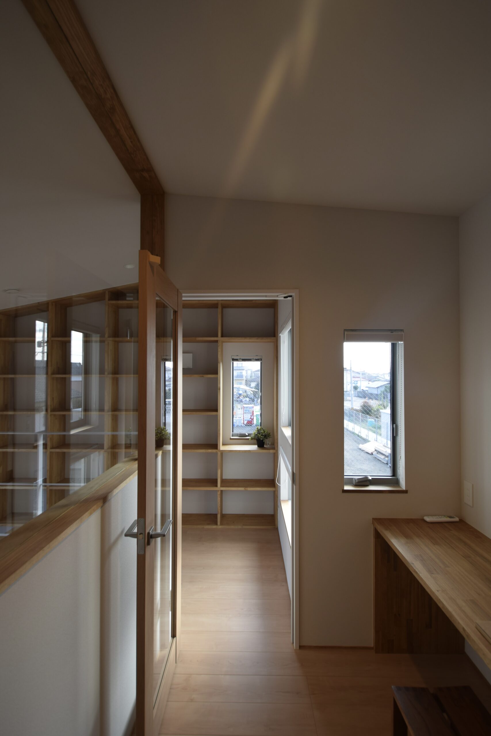 個室は小さくシンプルに、代わりにリビング脇のお子さん達のデスクコーナー、本棚の中の読書椅子、2階ホールのリモートワークにも最適なデスクスペース、お庭を眺めながらコーヒーの飲めるキッチン横の窓辺のカウンターなどなど家族が思い思いに過ごせる居場所を散りばめました。家族の気配を感じながら好きな居場所でゆっくり過ごせる機能的でちょうどいい建築となりました。